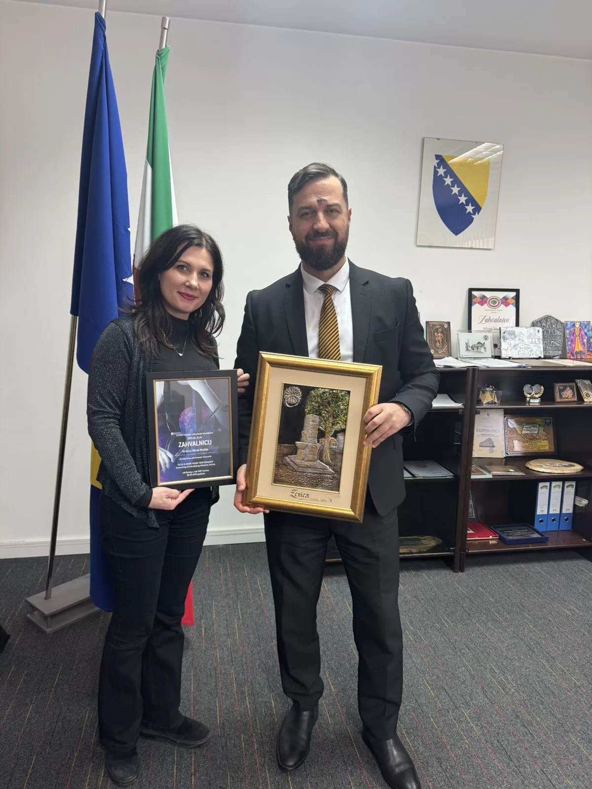 Tanisa Cikotić, dirigentica Kamernog simfonijskog orkestra Zenica, uručila je danas zahvalnicu ministru za obrazovanje, nauku, kulturu i sport Zeničko-dobojskog kantona, Mirzi Mušiji, za podršku realizaciji muzičkog projekta „EX YU Rock & Movie Music Performance“.